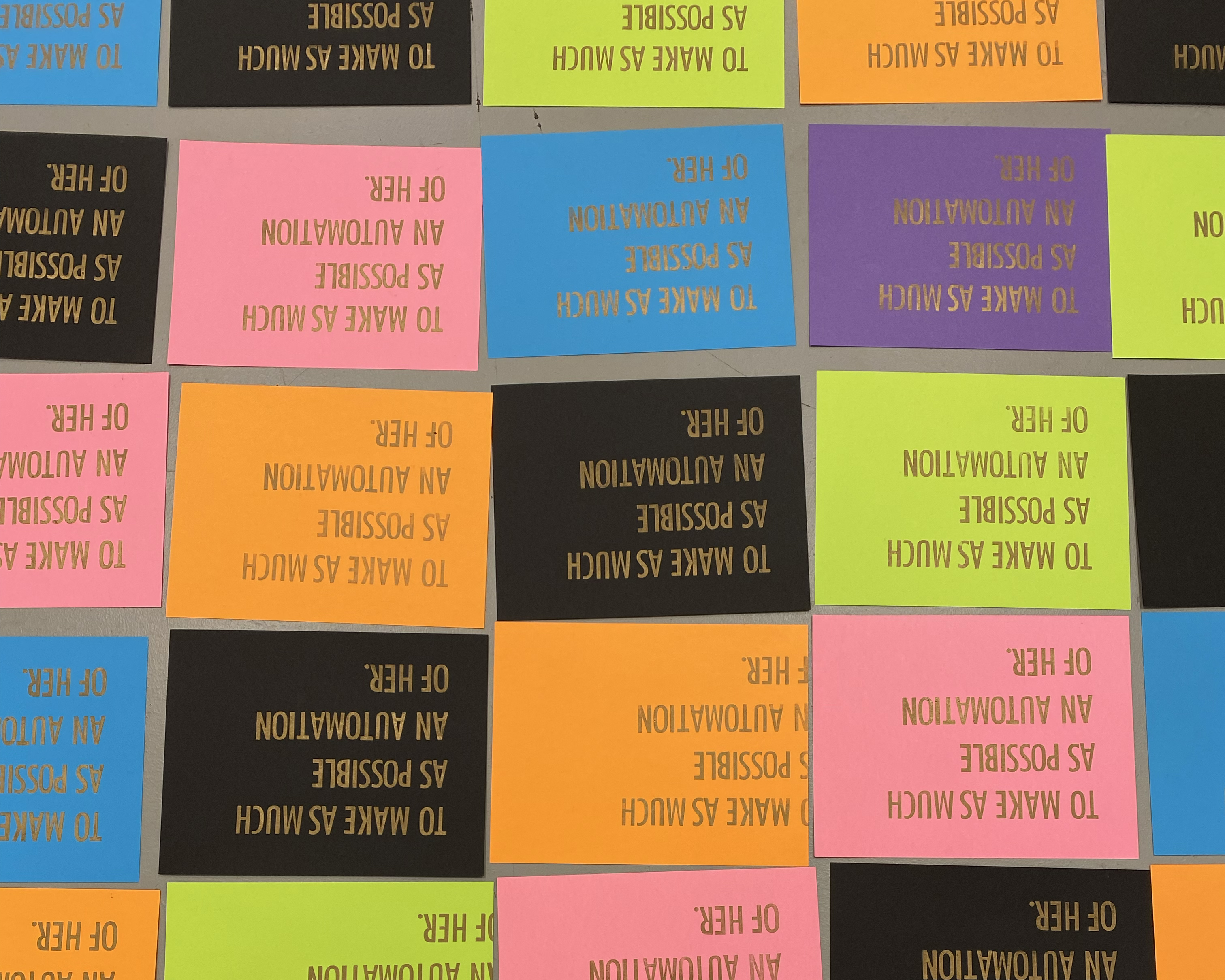 The 42 letter-sized panels that make this installation are imprinted with brass-inked words set in wood type. Using my Vandercook #4 printing press, I printed Donnelly’s words in multiples. The words are overprinted with organic and geometric abstract shapes. The abstract additions cancel out the automated action of printing the same words with rigidity. Instead, they create an organic pattern that overlays are redirects the eye as it moves across the assembled panels, now joined to create one large and dynamic composition.